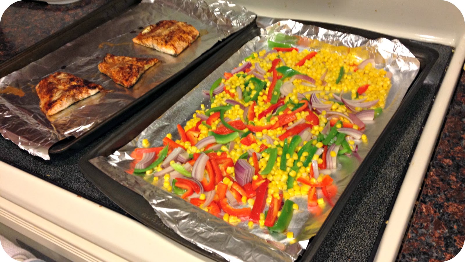 Toss remaining marinade from salmon with vegetables. Spray second baking sheet with cooking oil. Spread vegetables out on cooking sheet.