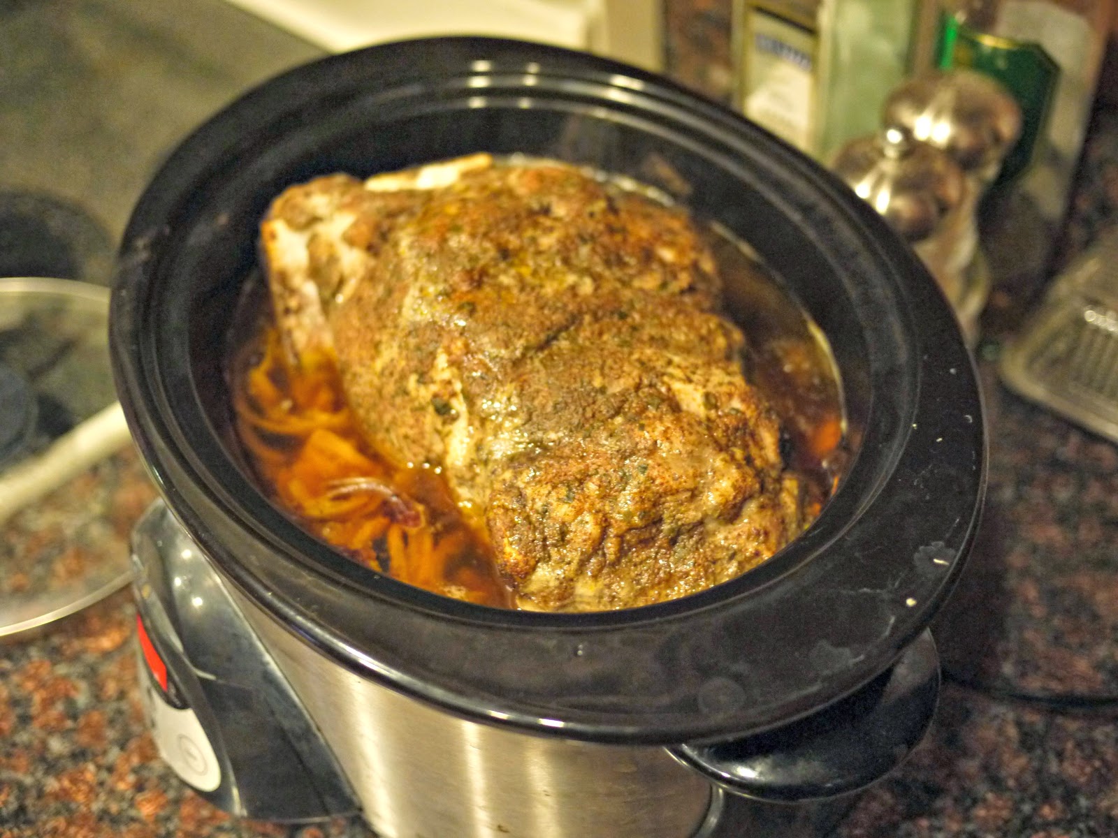 Place meat on top of the onions and close the crock pot lid. Cook the meat for 5-6 hours on high. Then lower the heat to low and cook an additional 3-4 hours. You do not have to add any liquid. At the end of the cooking time, your pork will look like this: