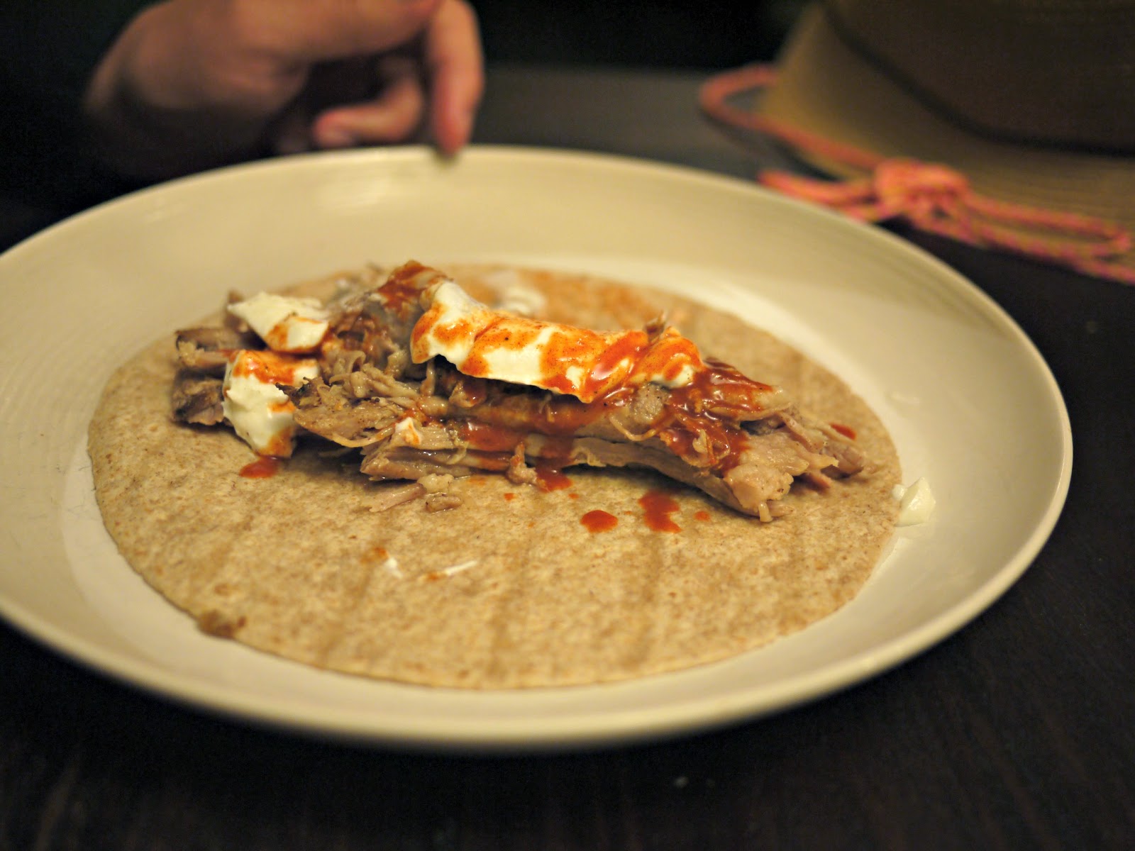 We chose to have carnitas burritos the night we made it.  We used whole wheat tortillas with sour cream and Tapatio sauce.