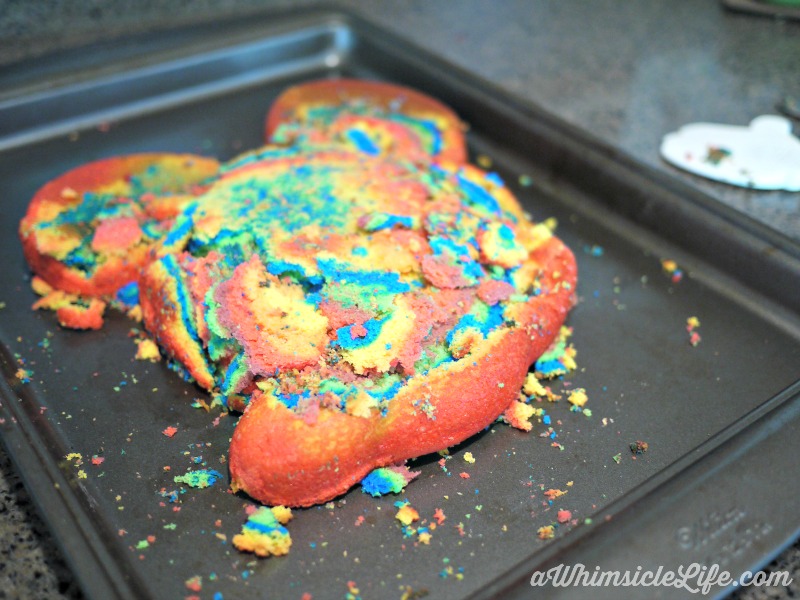 Clearly, I am not the cake boss! Thankfully, my mom saved the day. She sliced the cake into pieces and packed it into a square glass serving dish. I frosted it with my go-to amazing cream cheese frosting. We then placed a foil Mickey Mouse head cutout on top and had Llama attack it with sprinkles.