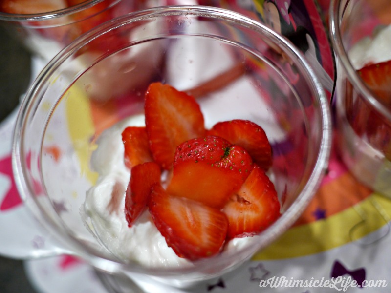 I made Belle’s Strawberry roses by cutting two strawberries: one sliced like a flower around the center and the other into slices to use as petals. The berries rested on little pillows of whipped cream. Since we already had a dessert, I called this course our “salad”. Mmmm.. if only every salad could include whipped cream.