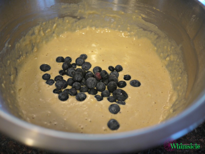 First mix the ingredients in the recipe below to make your batter. Once your batter is mixed, gently mix in 1/4 – 1/2 cup of fresh blueberries. You can use any fruit you want here, but I’m a personal fan of blueberries because they keep their shape and don’t discolor the batter.